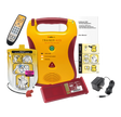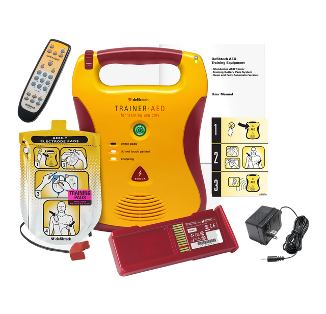 The AED Trainer includes a training unit, adult pads, a rechargeable battery, charger, remote, and instructions.